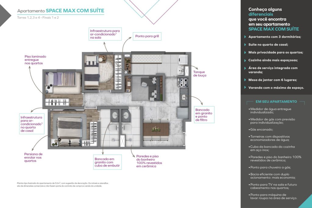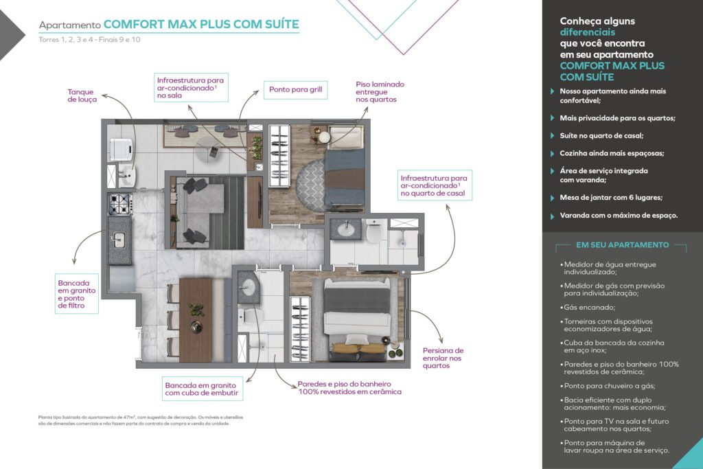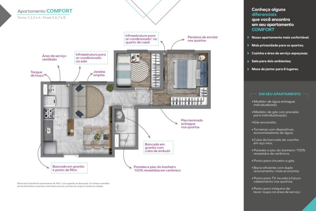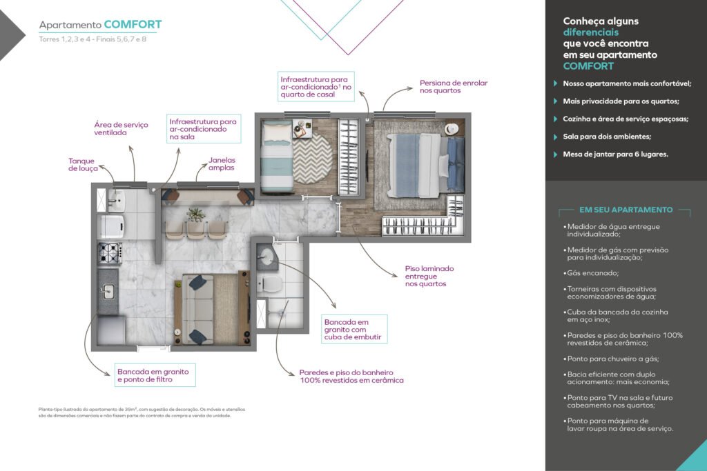 São apartamentos de 39, 47 e 53 metros, 2 e 3 dormitórios com varanda e opção de suíte e vaga de garagem, sobretudo uma Região Nobre com muita oferta de transporte público e facilidade sempre ao alcance.