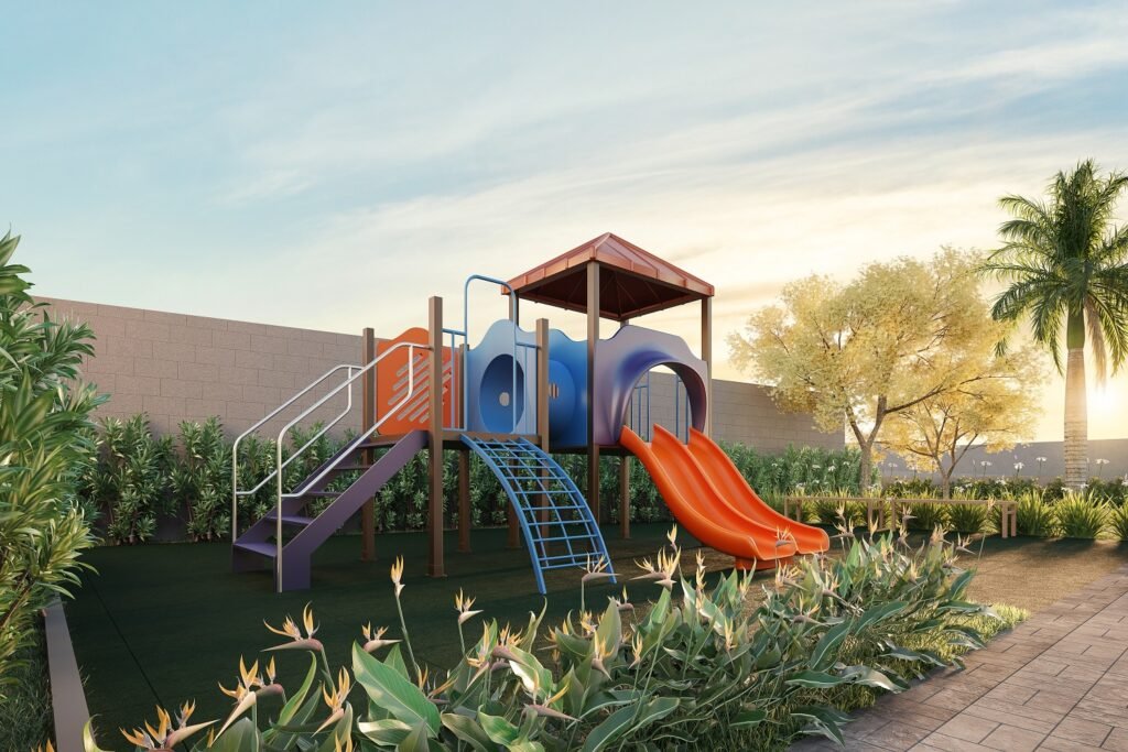 Acesso de pedestre, Portaria com clausura de, pedestre social e de serviço, Acesso de Veículos, Vagas Descobertas, Edifício Garagem, Brinquedoteca, Playground Baby, Games, Piscina Adulto, Solarium, Piscina Infantil.