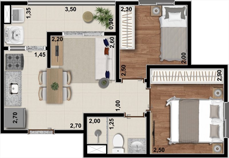 São apartamentos de 1 e 2 dormitórios, com ou sem varanda, de 24 a 34 metros, sendo assim temos 5 opções de plantas